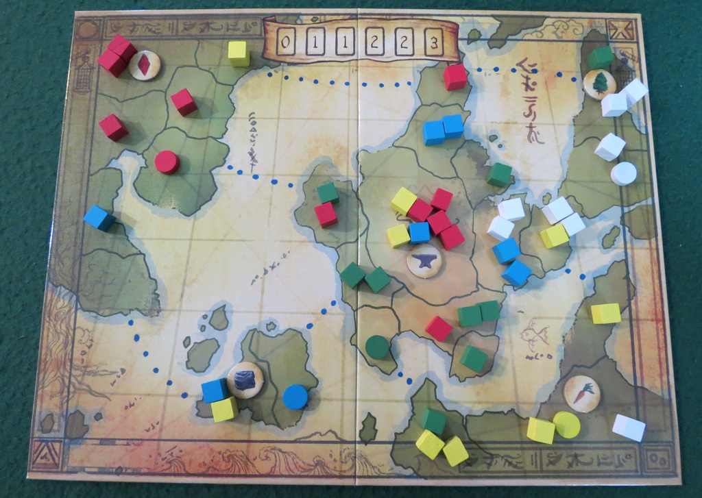 | The map (the game comes with two), cubes are armies, discs are cities, round tokens are a variant (preplaced resources) |
